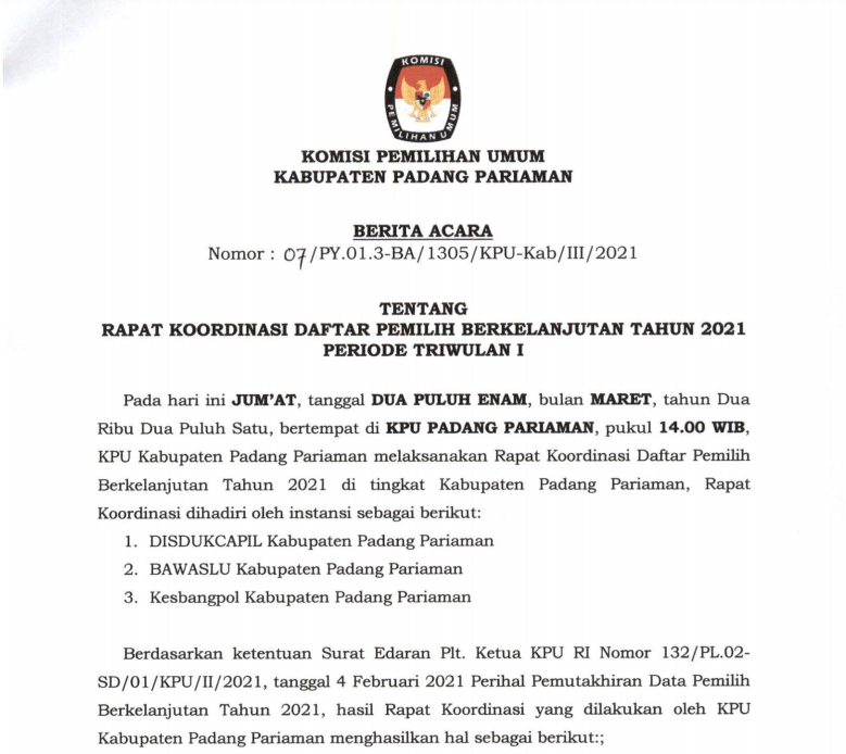 Parit Malintang, kab-padangpariaman.kpu.go.id| Berdasarkan Surat Edaran Plt. Ketua KPU RI Nomor 132/PL.02-SD/01/KPU/II/2021 tanggal 4 Februari 2021 Perihal Pemutakhiran Data Pemilih Berkelanjutan Tahun 2021, dan Hasil Rapat Koordinasi dengan instansi terkait, KPU Kabupaten Padang Pariaman menghasilkan hal sebagai berikut : …