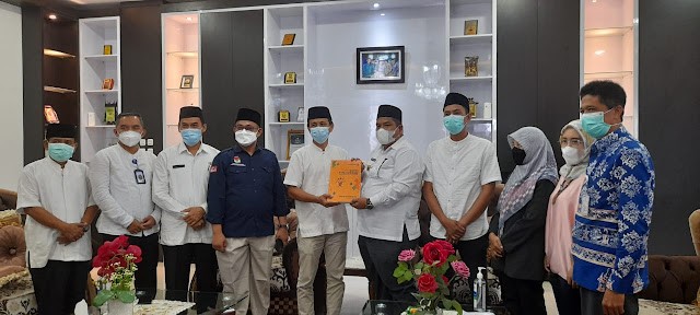 PARIT MALINTANG- Bupati Padang Pariaman Suhatri Bur,S.E.,M.M. menerima audiensi dari KPU Padang Pariaman tentang penyampaian laporan tahapan pemilihan tahun 2020 pada Jumat (30/04/2021) di ruang Bupati Padang Pariaman.