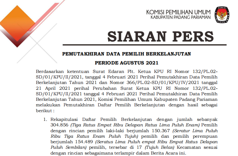 Parit Malintang, kab-padangpariaman.kpu.go.id - Berdasarkan ketentuan Surat Edaran Plt. Ketua KPU RI Nomor 132/PL.02-SD/01/KPU/II/2021 tanggal 4 februari 2021 Perihal Pemutakhiran Data Pemilih Berkelanjutan Tahun 2021, Komisi Pemilihan Umum Kabupaten Padang Pariaman melakukan pemutakhiran Daftar Pemilih berkelanjutan dengan hasil….,