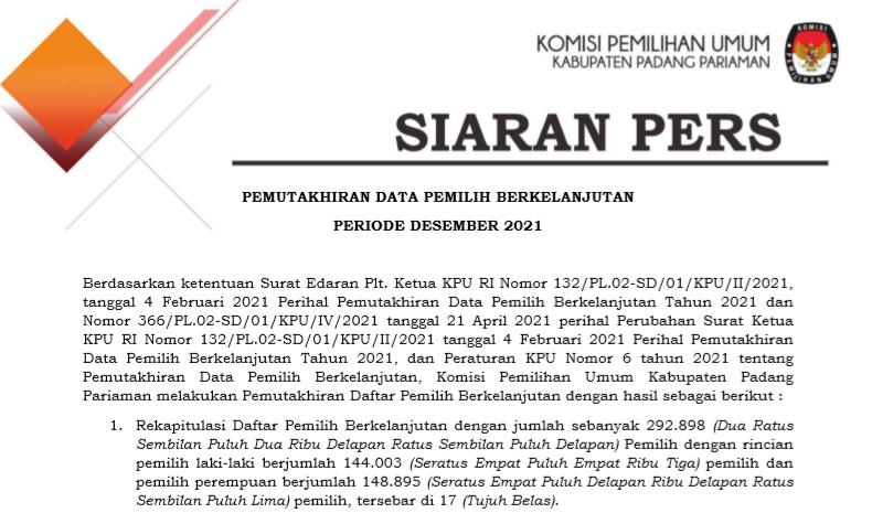 Parit Malintang, kab-padangpariaman.kpu.go.id - Berdasarkan ketentuan Surat Edaran Plt. Ketua KPU RI Nomor 132/PL.02-SD/01/KPU/II/2021 tanggal 4 februari 2021 Perihal Pemutakhiran Data Pemilih Berkelanjutan Tahun 2021, Komisi Pemilihan Umum Kabupaten Padang Pariaman melakukan pemutakhiran Daftar Pemilih berkelanjutan dengan hasil….,