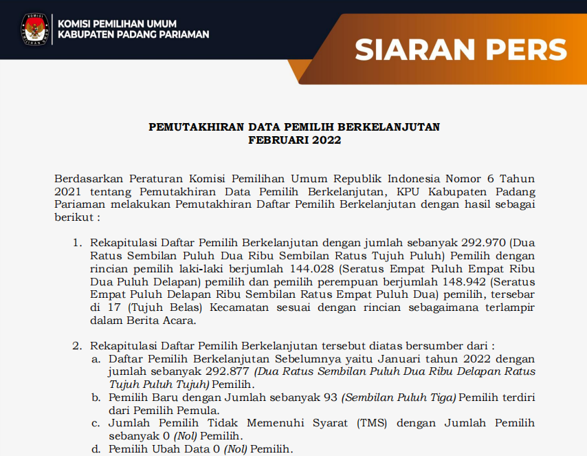 Parit Malintang, kab-padangpariaman.kpu.go.id - Berdasarkan Peraturan Komisi Pemilihan Umum Republik Indonesia Nomor 6 Tahun 2021 tentang Pemuktahiran Data Pemilih Berkelanjutan, KPU Kabupaten Padang Pariaman melakukan pemutakhiran Daftar Pemilih berkelanjutan dengan hasil….