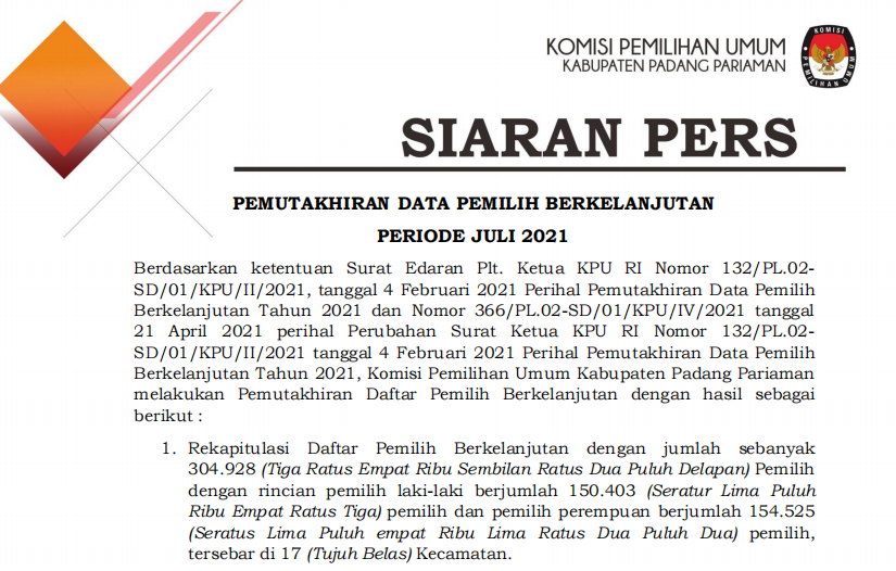 Parit Malintang, kab-padangpariaman.kpu.go.id - Berdasarkan ketentuan Surat Edaran Plt. Ketua KPU RI Nomor 132/PL.02-SD/01/KPU/II/2021 tanggal 4 februari 2021 Perihal Pemutakhiran Data Pemilih Berkelanjutan Tahun 2021, Komisi Pemilihan Umum Kabupaten Padang Pariaman melakukan pemutakhiran Daftar Pemilih berkelanjutan dengan hasil….,