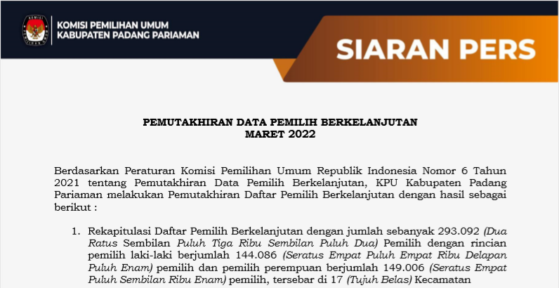 Parit Malintang, kab-padangpariaman.kpu.go.id - Berdasarkan Peraturan Komisi Pemilihan Umum Republik Indonesia Nomor 6 Tahun 2021 tentang Pemuktahiran Data Pemilih Berkelanjutan, KPU Kabupaten Padang Pariaman melakukan pemutakhiran Daftar Pemilih berkelanjutan dengan hasil….