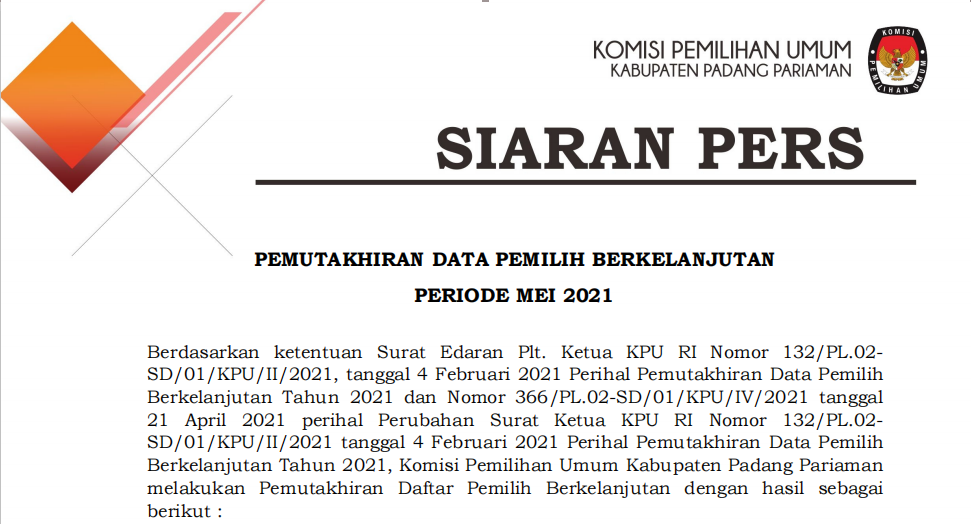 Parit Malintang, kab-padangpariaman.kpu.go.id - Berdasarkan ketentuan Surat Edaran Plt. Ketua KPU RI Nomor 132/PL.02-SD/01/KPU/II/2021 tanggal 4 februari 2021 Perihal Pemutakhiran Data Pemilih Berkelanjutan Tahun 2021, Komisi Pemilihan Umum Kabupaten Padang Pariaman melakukan pemutakhiran Daftar Pemilih berkelanjutan dengan hasil…., selanjutnya silahkan klik disini