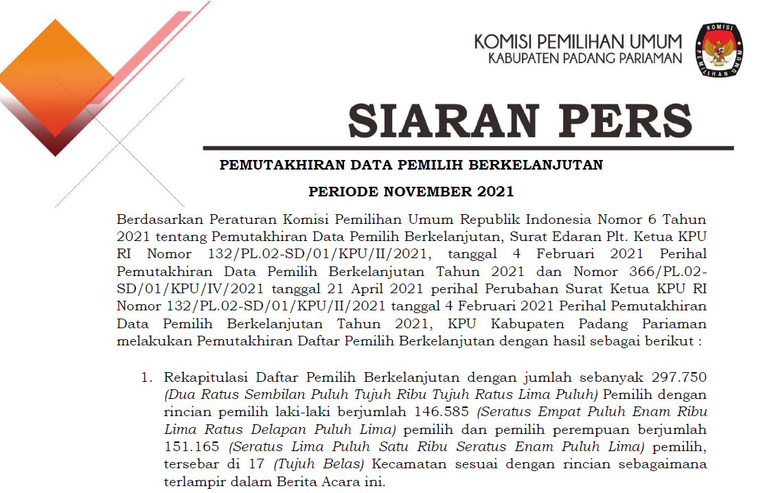 Parit Malintang, kab-padangpariaman.kpu.go.id - Berdasarkan ketentuan Surat Edaran Plt. Ketua KPU RI Nomor 132/PL.02-SD/01/KPU/II/2021 tanggal 4 februari 2021 Perihal Pemutakhiran Data Pemilih Berkelanjutan Tahun 2021, Komisi Pemilihan Umum Kabupaten Padang Pariaman melakukan pemutakhiran Daftar Pemilih berkelanjutan dengan hasil….,