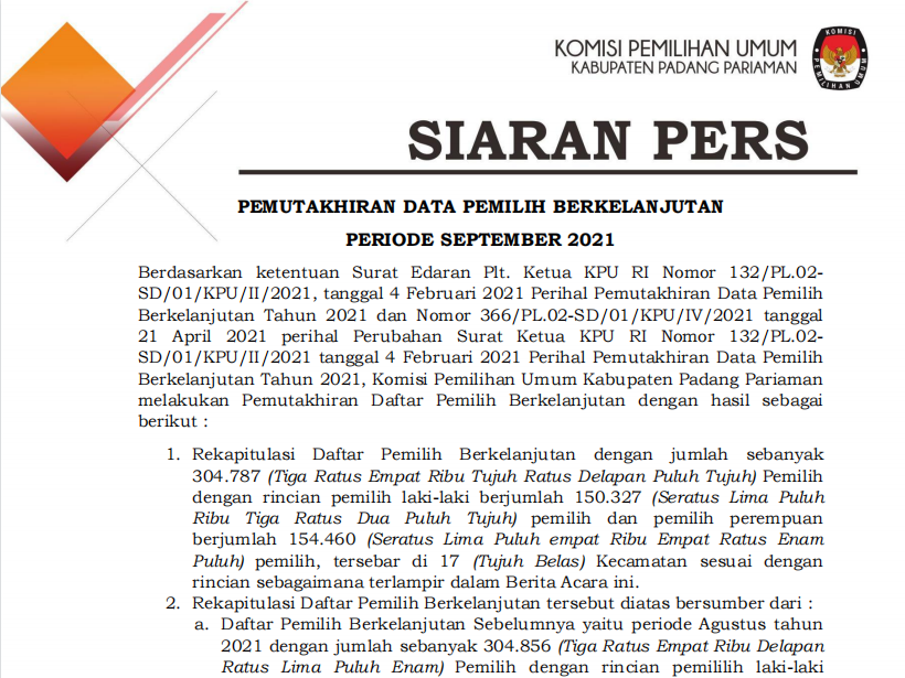 Parit Malintang, kab-padangpariaman.kpu.go.id - Berdasarkan ketentuan Surat Edaran Plt. Ketua KPU RI Nomor 132/PL.02-SD/01/KPU/II/2021 tanggal 4 februari 2021 Perihal Pemutakhiran Data Pemilih Berkelanjutan Tahun 2021, Komisi Pemilihan Umum Kabupaten Padang Pariaman melakukan pemutakhiran Daftar Pemilih berkelanjutan dengan hasil….,