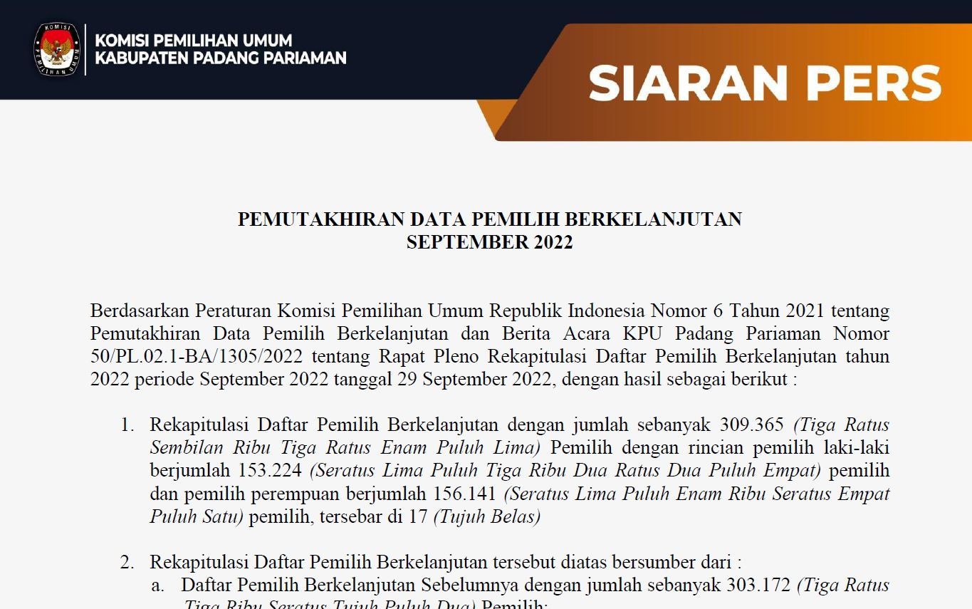 Parit Malintang, kab-padangpariaman.kpu.go.id - Berdasarkan Peraturan Komisi Pemilihan Umum Republik Indonesia Nomor 6 Tahun 2021 tentang Pemuktahiran Data Pemilih Berkelanjutan, KPU Kabupaten Padang Pariaman melakukan pemutakhiran Daftar Pemilih berkelanjutan dengan hasil….