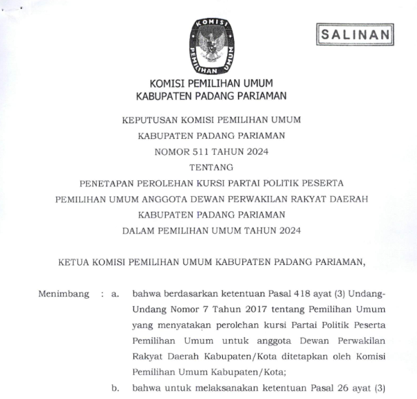 PENETAPAN JUMLAH KURSI PARTAI POLITIK PESERTA PEMILIHAN UMUM ANGGOTA DEWAN PERWAKILAN RAKYAT DAERAH KABUPATEN PADANG PARIAMAN DALAM PEMILIHAN UMUM TAHUN 2024