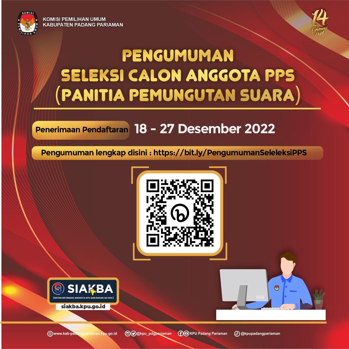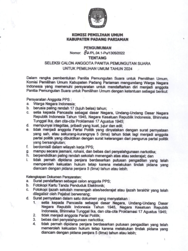 PENGUMUMAN CALON ANGGOTA PANITIA PEMUNGUTAN SUARA PEMILU 2024 Minggu, 18 Desember 2022 10:58 1704 Silahkan Download Pengumuman Lengkap DISINI Pendaftaran SIAKBA DISINI Bagikan: Dilihat 1,704 Kali.