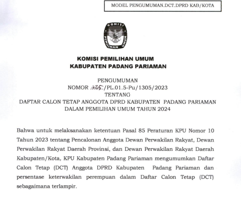 PENGUMUMAN DAFTAR CALON TETAP ANGGOTA DPRD KABUPATEN PADANG PARIAMAN DALAM PEMILIHAN UMUM TAHUN 2024