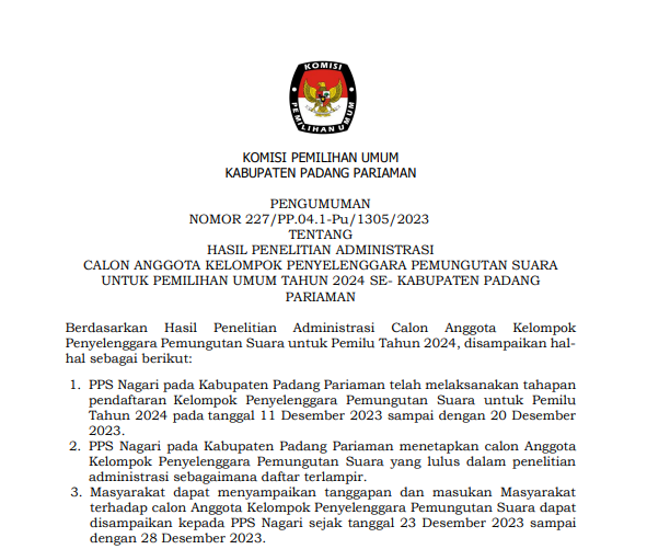 PENGUMUMAN KOMISI PEMILIHAN UMUM KABUPATEN PADANG PARIAMAN NOMOR 227/PP.04.1/PU1305/2023 TENTANG HASIL SELEKSI ADMINISTRASI CALON ANGGOTA KELOMPOK PENYELENGGARA PEMUNGUTAN SUARA UNTUK PEMILIHAN UMUM TAHUN 2024 SE- KABUPAYEN PADANG PARIAMAN