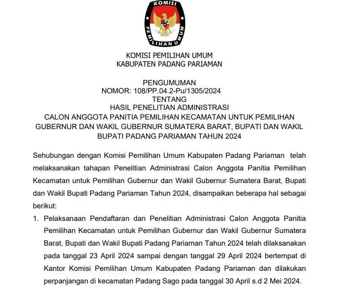 PENGUMUMAN KOMISI PEMILIHAN UMUM KABUPATEN PADANG PARIAMAN NOMOR: 108/PP.04.2-Pu/1305/2024 TENTANG HASIL PENELITIAN ADMINISTRASI CALON ANGGOTA PANITIA PEMILIHAN KECAMATAN UNTUK PEMILIHAN GUBERNUR DAN WAKIL GUBERNUR SUMATERA BARAT, BUPATI DAN WAKIL BUPATI PADANG PARIAMAN TAHUN 2024