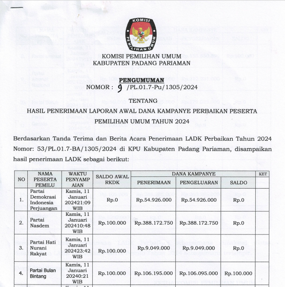 PENGUMUMAN HASIL PENERIMAAN LAPORAN AWAL DANA KAMPANYE PERBAIKAN PESERTA PEMILIHAN UMUM TAHUN 2024