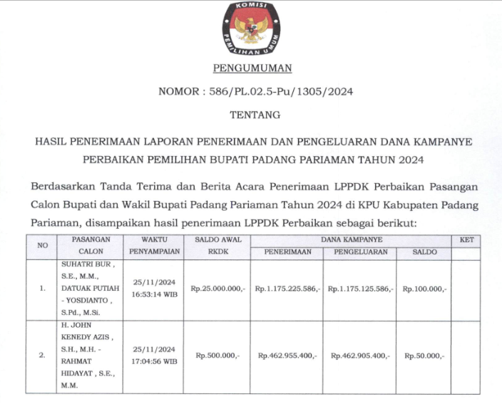 Pengumuman Komisi Pemilihan Umum Kabupaten Padang Pariaman Nomor : 586/PL.02.5-Pu/1305/2024 Tentang Hasil Penerimaan Laporan Penerimaan dan Pengeluaran Dana Kampanye Perbaikan Pemilihan Bupati Padang Pariaman Tahun 2024