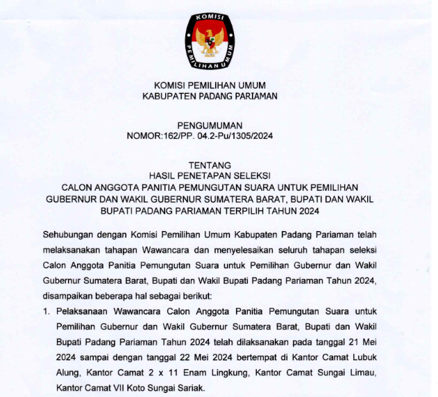 PENGUMUMAN KOMISI PEMILIHAN UMUM KABUPATEN PADANG PARIAMAN NOMOR: 162/PP.04.2-Pu/1305/2024 TENTANG HASIL PENETAPAN SELEKSI CALON ANGGOTA PANITIA PEMUNGUTAN SUARA UNTUK PEMILIHAN GUBERNUR & WAKIL GUBERNUR SUMBAR, BUPATI & WAKIL BUPATI PADANG PARIAMAN TERPILIH TAHUN 2024