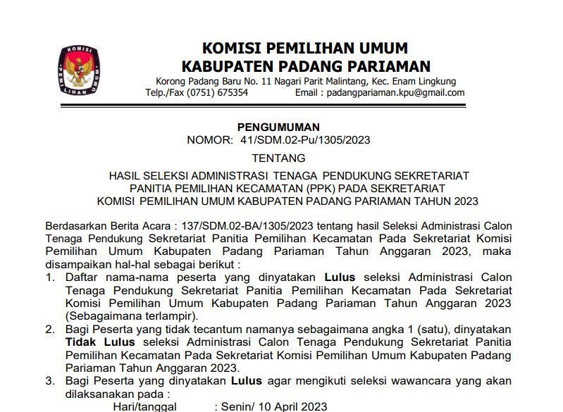 PENGUMUMAN HASIL SELEKSI ADMINISTRASI TENAGA PENDUKUNG SEKRETARIAT PANITIA PEMILIHAN KECAMATAN (PPK) PADA SEKRETARIAT KPU KABUPATEN PADANG PARIAMAN TAHUN 2023