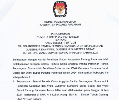 PENGUMUMAN KOMISI PEMILIHAN UMUM KABUPATEN PADANG PARIAMAN NOMOR: 150/PP.04.2-Pu/1305/2024 TENTANG TENTANG HASIL SELEKSI TERTULIS CALON ANGGOTA PANITIA PEMUNGUTAN SUARA UNTUK PEMILIHAN GUBERNUR & WAKIL GUBERNUR SUMBAR, BUPATI & WAKIL BUPATI PADANG PARIAMAN TAHUN 2024