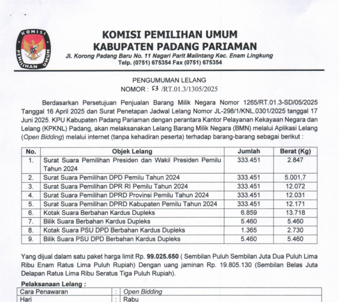 Pengumuman Lelang Komisi Pemilihan Umum Kabupaten Padang Pariaman Nomor:53/RT.01.3/1305/2025.
