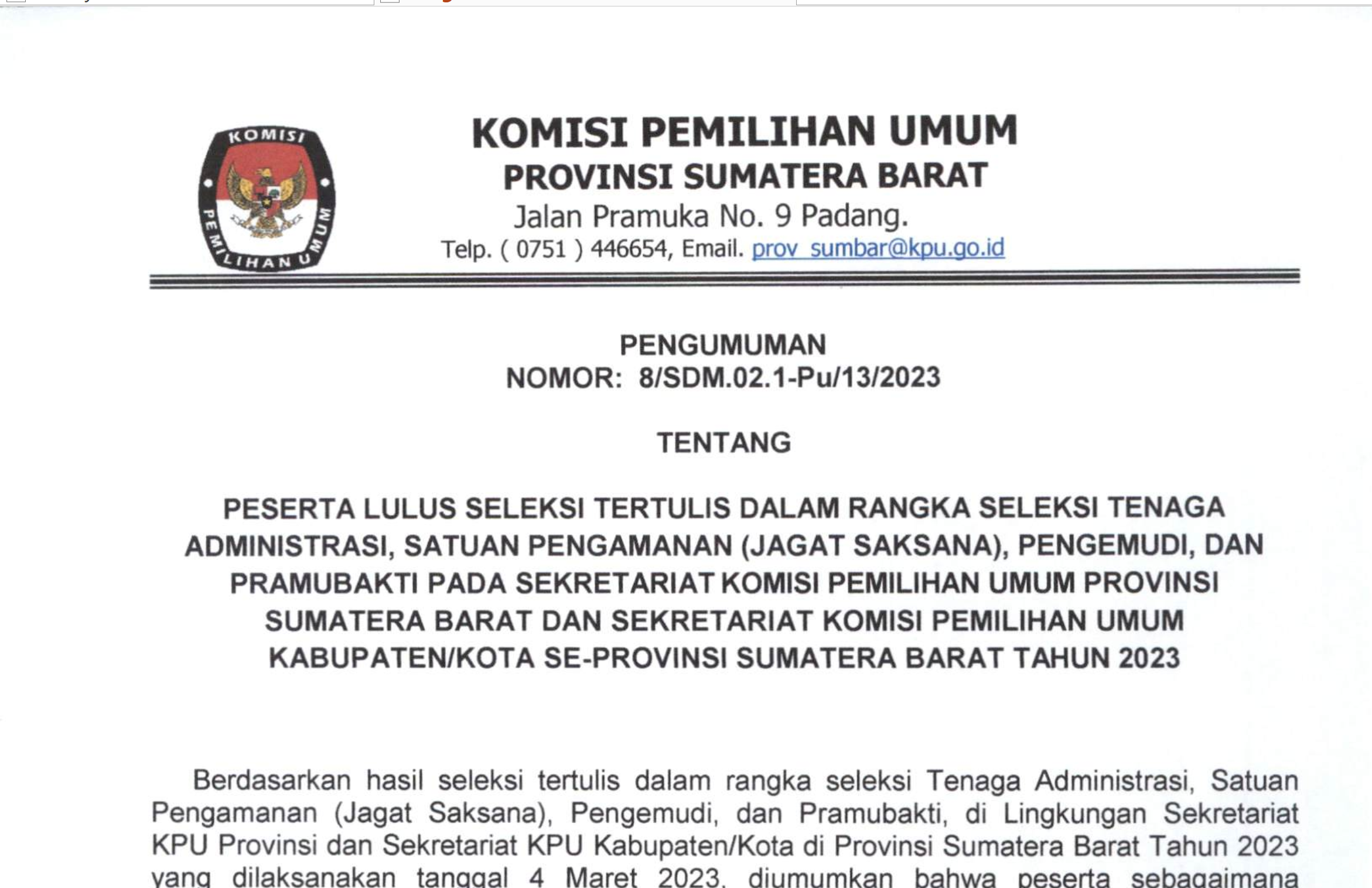 PENGUMUMAN LULUS SELEKSI TERTULIS TENAGA ADM, PENGAMANAN, PENGEMUDI, & PRAMUBAKTI DI KPU PROV/KAB/KOTA SE-SUMATERA BARAT TAHUN 2023
