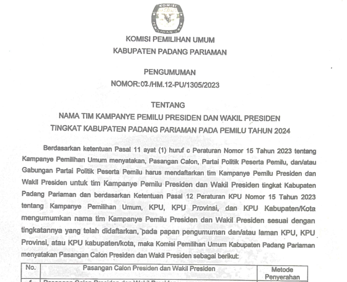 Pengumuman Komisi Pemilihan Umum Kabupaten Padang Pariaman Nomor : 02/HM.12-PU/1305/2023 Tentang Nama Tim Kampanye Pemilu Presiden & Wakil Presiden Tingkat Kabupaten Padang Pariaman :