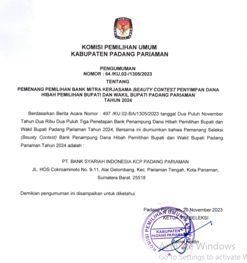 PENGUMUMAN PEMENANG PEMILIHAN BANK MITRA KERJASAMA BEUTY CONTEST PENYIMPAN DANA HIBAH PEMILIHAN BUPATI DAN WAKIL BUPATI PADANG PARIAMAN TAHUN 2024