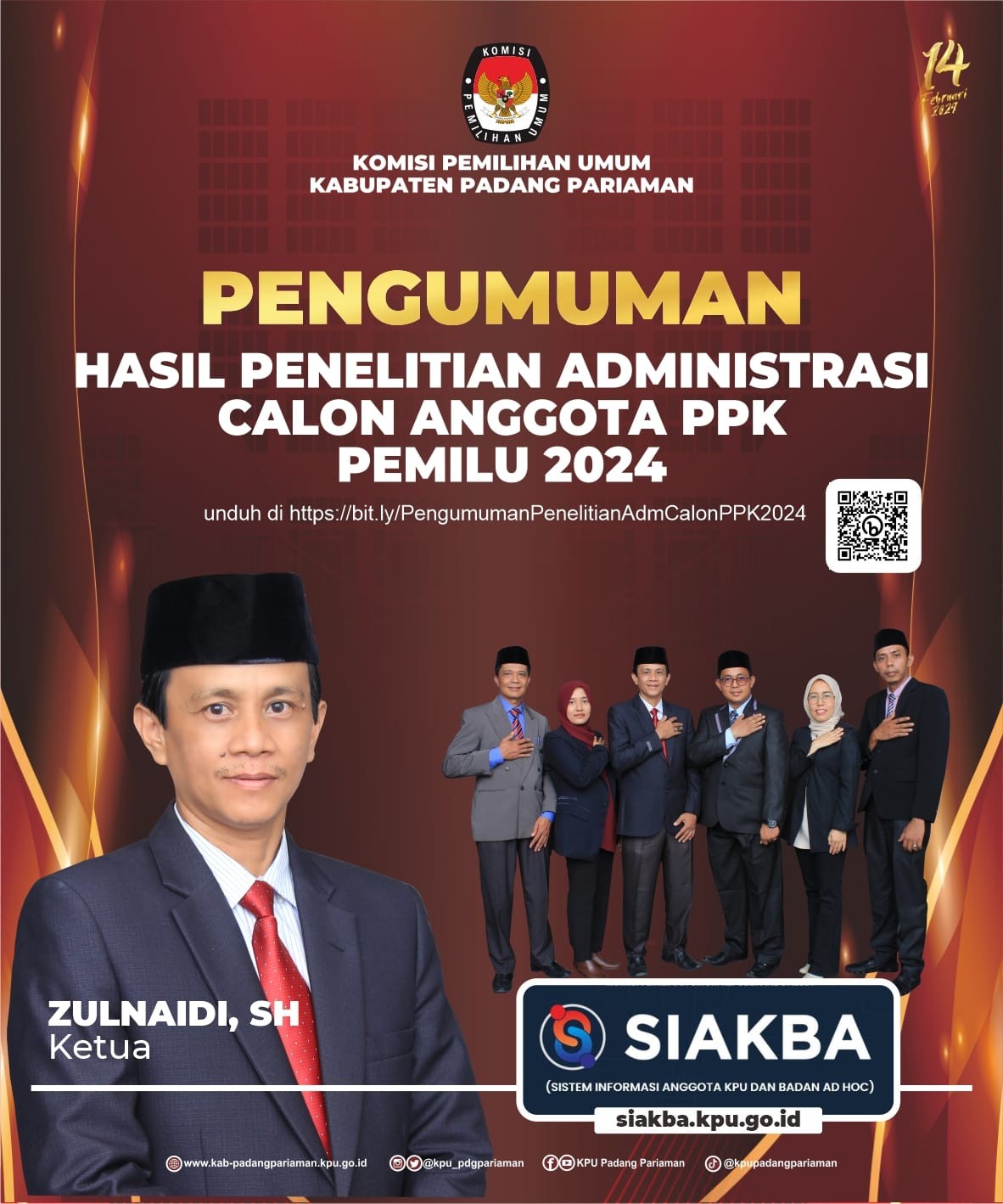 - Bagi Peserta yang tidak tercantum namanya sebagai mana angka 1 (satu) diatas, dinyatakan Tidak Lulus seleksi administrasi calon Anggota Panitia Pemilihan Kecamatan untuk Pemilihan Umum Tahun 2024 di Kabupaten Padang Pariaman.