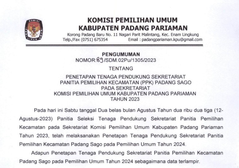 Pengumuman KPU Kabupaten Padang Pariaman Nomor 89/SDM.02Pu/1305/2023 tentang Penetapan Tenaga Pendukung Sekretariat Panitia Pemilihan Kecamatan (PPK) Padang Sago Pada Sekretariat KPU Kabupaten Padang Pariaman Tahun 2023