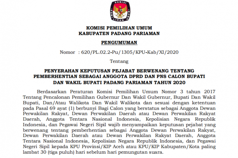 Pengumuman Penyerahan Keputusan Pejabat Berwenang Tentang Pemberhentian Sebagai Anggota DPRD dan PNS Calon Bupati dan Wakil Bupati Padang Pariaman Tahun 2020