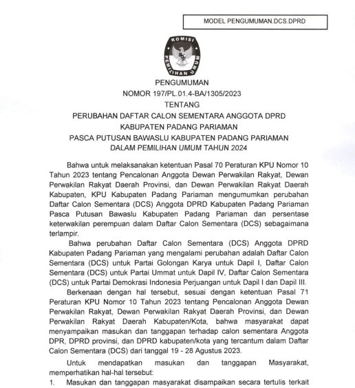 Pengumuman KPU Kabupaten Padang Pariaman Nomor 197/PL.01.4-BA/1305/2023 tentang Perubahan Daftar Calon Sementara Anggota DPRD Kabupaten Padang Pariaman Pasca Putusan Bawaslu Dalam Pemilihan Umum Tahun 2024.