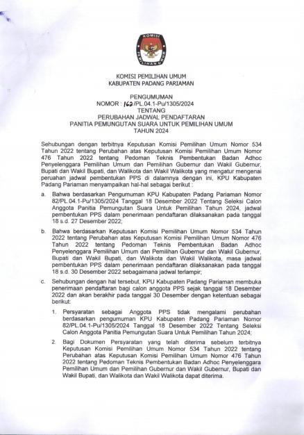 PENGUMUMAN PERUBAHAN JADWAL PENDAFTARAN PANITIA PEMUNGUTAN SUARA PEMILIHAN TAHUN 2024 Jumat, 23 Desember 2022 11:00 520 SILAHKAN DOWNLOAD PENGUMUMAN LENGKAP DISINI FORMAT PERNYATAAN TERBARU DISINI SURAT PERNYATAAN BAGI CALON ANGGOTA PPS YANG NAMA ATAU IDENTITASNYA TERDAFTAR DI SIPOL TANPA SEPENGETAHUAN YANG BERSANGKUTAN DISINI Bagikan: Dilihat 520 Kali.