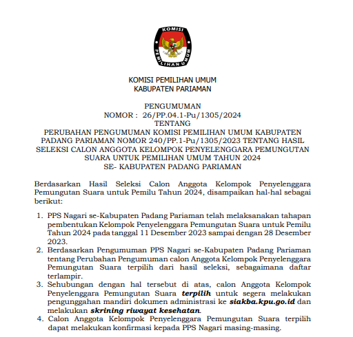 PENGUMUMAN NOMOR : 26/PP.04.1-Pu/1305/2024 TENTANG PERUBAHAN PENGUMUMAN KOMISI PEMILIHAN UMUM KABUPATEN PADANG PARIAMAN NOMOR 240/PP.1-Pu/1305/2023 TENTANG HASIL SELEKSI CALON ANGGOTA KELOMPOK PENYELENGGARA PEMUNGUTAN SUARA UNTUK PEMILIHAN UMUM TAHUN 2024 SE- KABUPATEN PADANG PARIAMAN