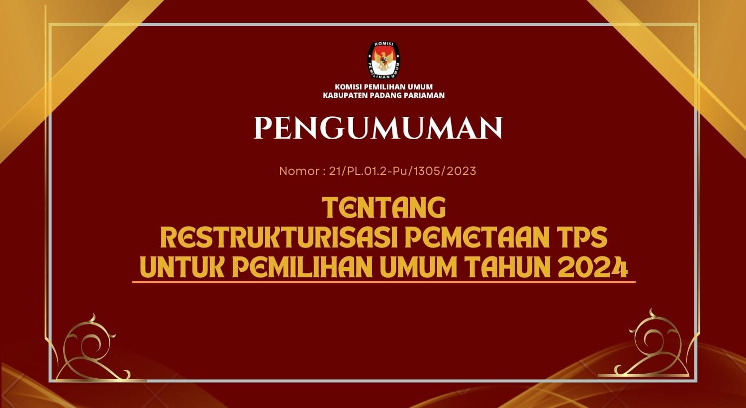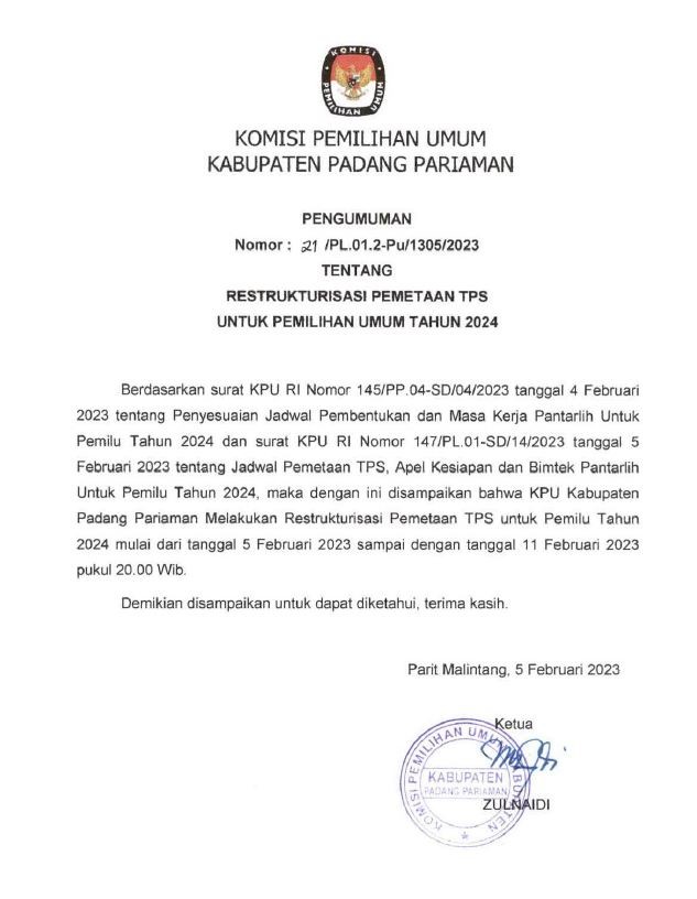 Pengumuman Restrukturisasi TPS untuk Pemilu Tahun 2024 Rabu, 08 Februari 2023 10:55 461 Silahkan Download File Pengumuman Disini Bagikan: Dilihat 461 Kali.