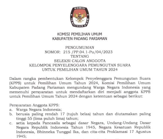 PENGUMUMAN KOMISI PEMILIHAN UMUM KABUPATEN PADANG PARIAMAN NOMOR. 215/PP.04.1.Pu/04/2023 TENTANG SELEKSI CALON ANGGOTA KELOMPOK PENYELENGGARA PEMUNGUTAN SUARA UNTUK PEMILU TAHUN 2024....