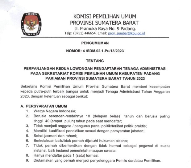 PERPANJANGAN KEDUA PENDAFTARAN TENAGA ADMINISTRASI KPU KABUPATEN PADANG PARIAMAN