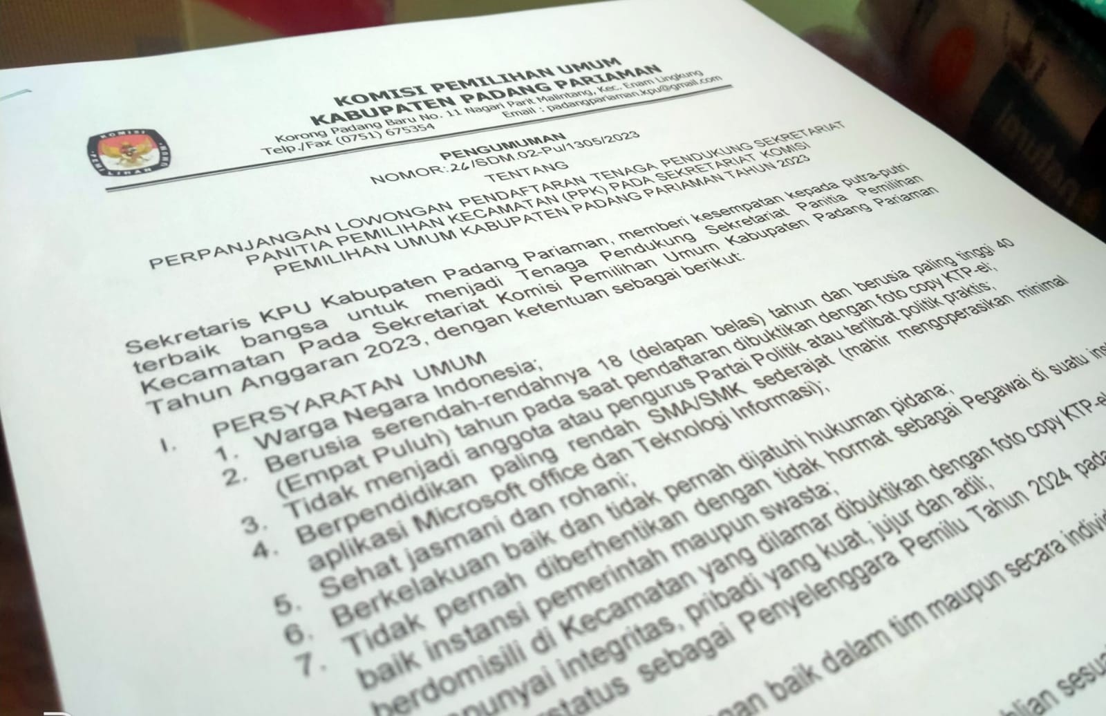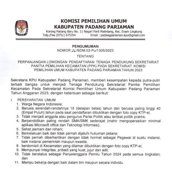 PERPANJANGAN LOWONGAN PENDAFTARAN TENAGA PENDUKUNG SEKRETARIAT PANITIA PEMILIHAN KECAMATAN (PPK) PADA SEKRETARIAT KOMISI PEMILIHAN UMUM KABUPATEN PADANG PARIAMAN Senin, 06 Maret 2023 17:08 235 Pengumuman Lengkap Silahkan Unduh >> Disini Bagikan: Dilihat 235 Kali.