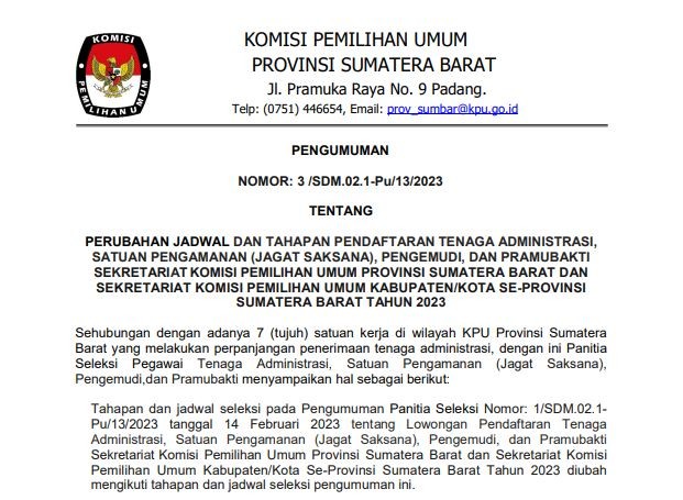 PENGUMUMAN KPU PROVINSI SUMBAR KLIK DISINI : https://sumbar.kpu.go.id/berita/baca/7923/perubahan-jadwal-tahapan-pendaftaran-tenaga-administrasi-satuan-pengamanan-jagat-saksana-pengemudi-pramubakti-sekretariat-kpu-provinsikabupatenkota-se-sumatera-barat-tahun-2023
