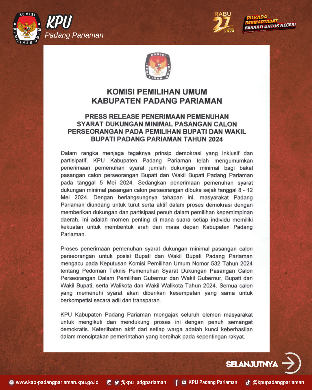 PRESS RELEASE PENERIMAAN PEMENUHAN SYARAT DUKUNGAN CALON PERSEORANGAN PADA PEMILIHAN BUPATI DAN BUPATI PADANG PARIAMAN TAHUN 2024