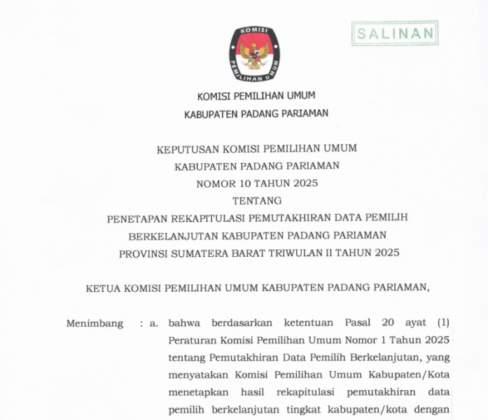 Keputusan Komisi Pemilihan Umum Kabupaten Padang Pariaman Nomor 10 Tahun 2025 tentang Penetapan Rekapitulasi Pemutakhiran Data Pemilih Berkelanjutan Kabupaten Padang Pariaman Provinsi Sumatera Barrat Triwulan II Tahun 2025.