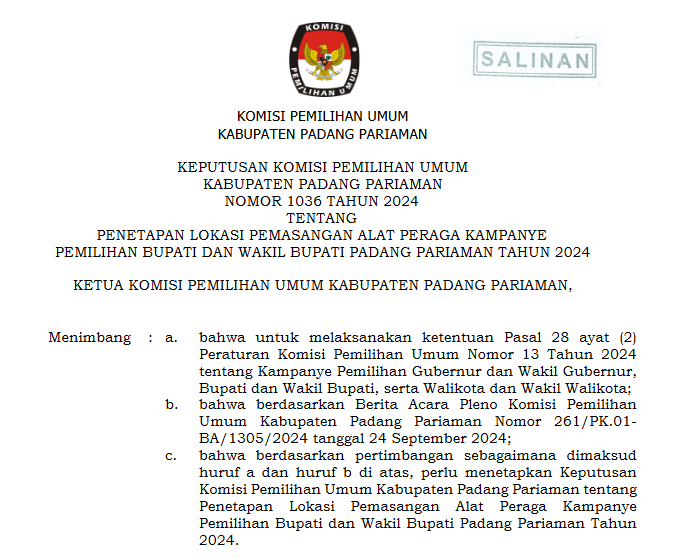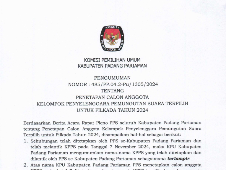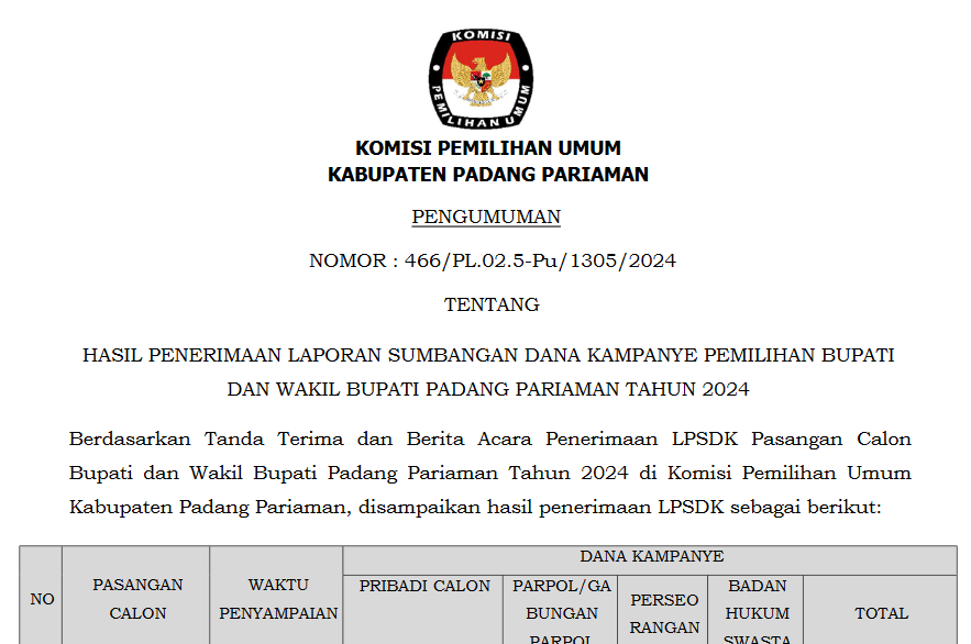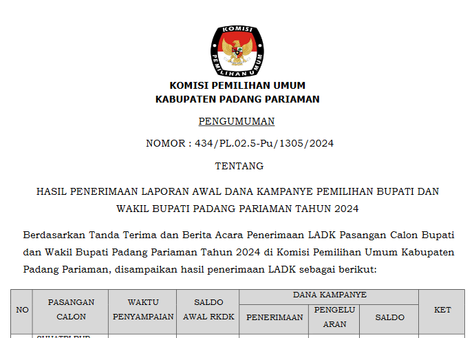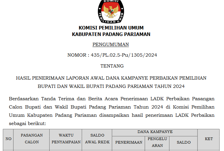 Pengumuman Komisi Pemilihan Umum Kabupaten Padang Pariaman Nomor : 586/PL.02.5-Pu/1305/2024 Tentang Hasil Penerimaan Laporan Penerimaan dan Pengeluaran Dana Kampanye Perbaikan Pemilihan Bupati Padang Pariaman Tahun 2024
