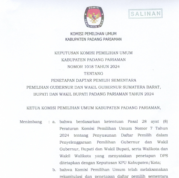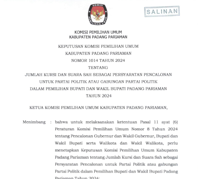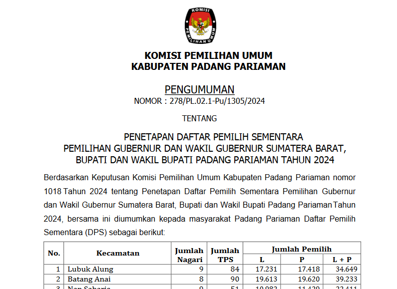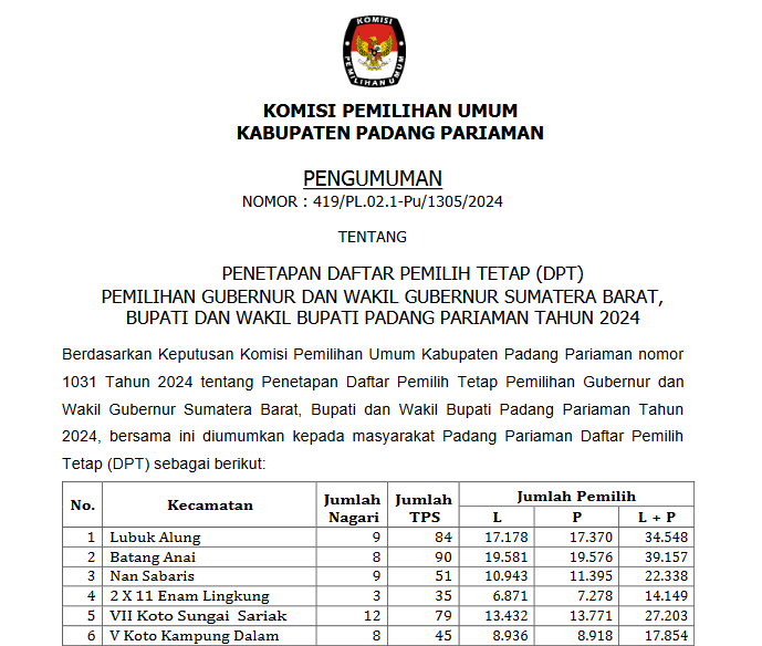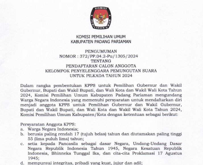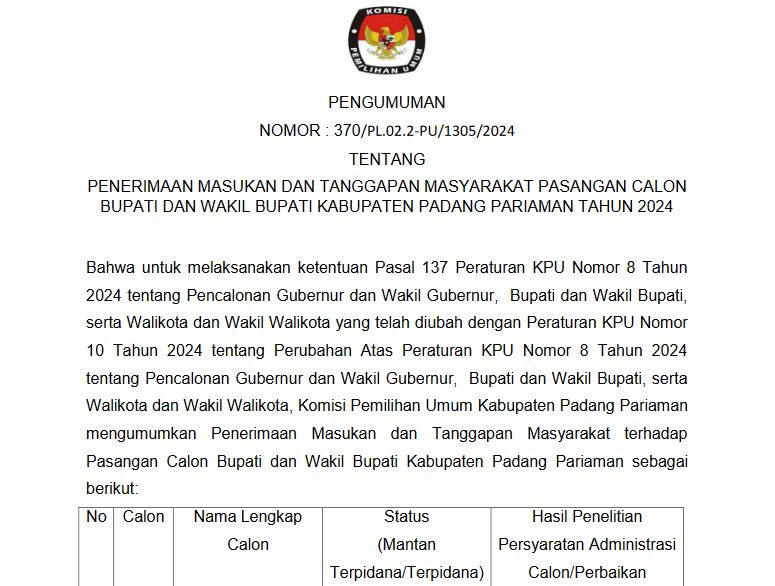 PENGUMUMAN KOMISI PEMILIHAN UMUM KABUPATEN PADANG PARIAMAN NOMOR: 370/PL.02.2-PU/1305/2024 TENTANG PENERIMAAN MASUKAN DAN TANGGAPAN MASYARAKAT PASANGAN CALON BUPATI DAN WAKIL BUPATI KABUPATEN PADANG PARIAMAN TAHUN 2024