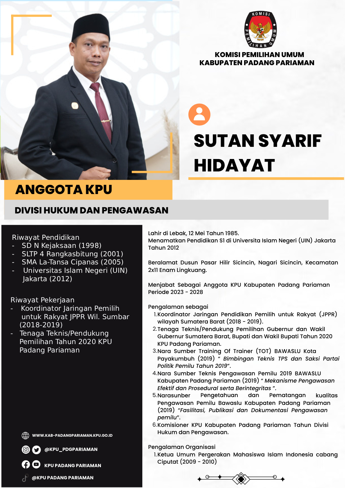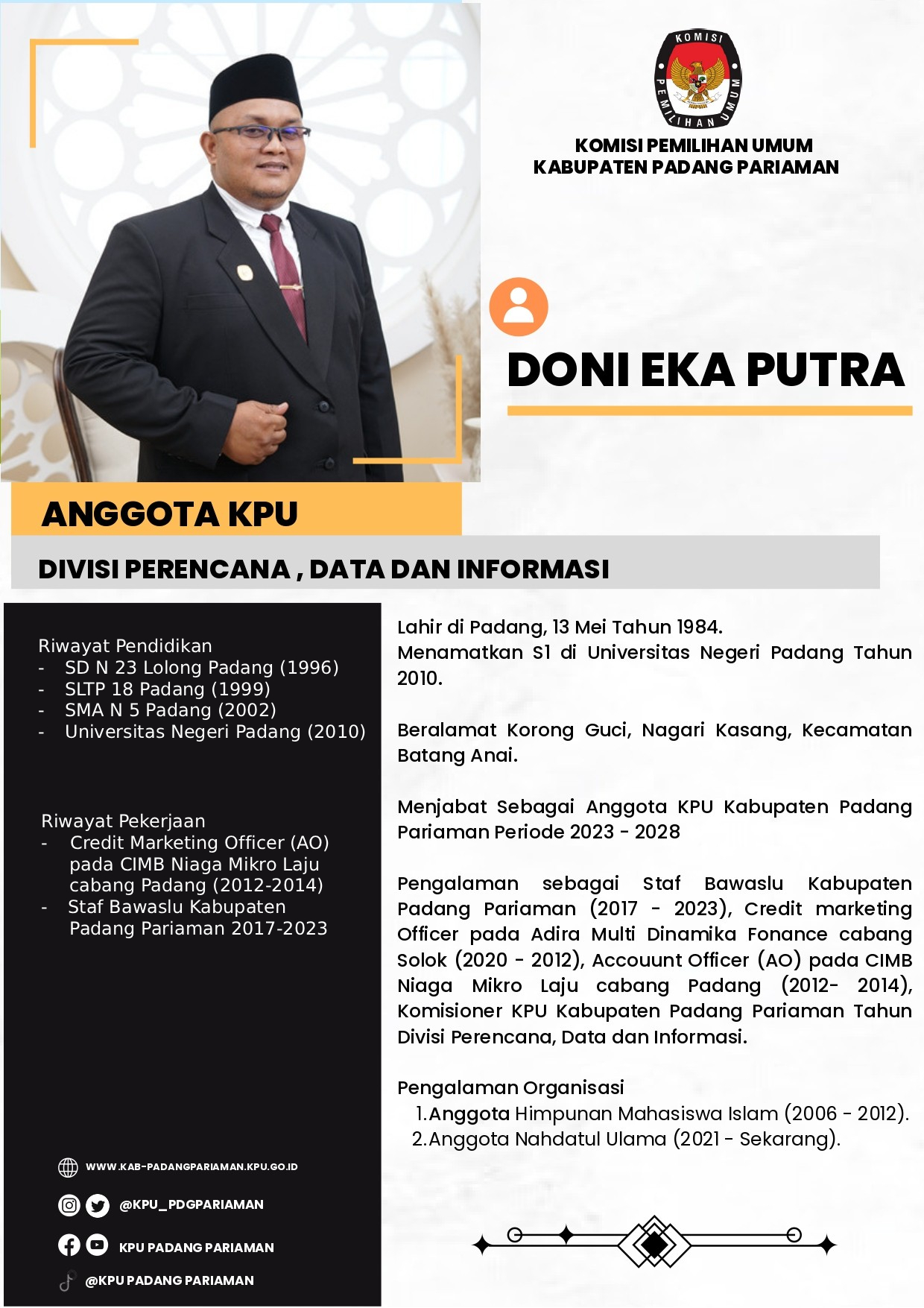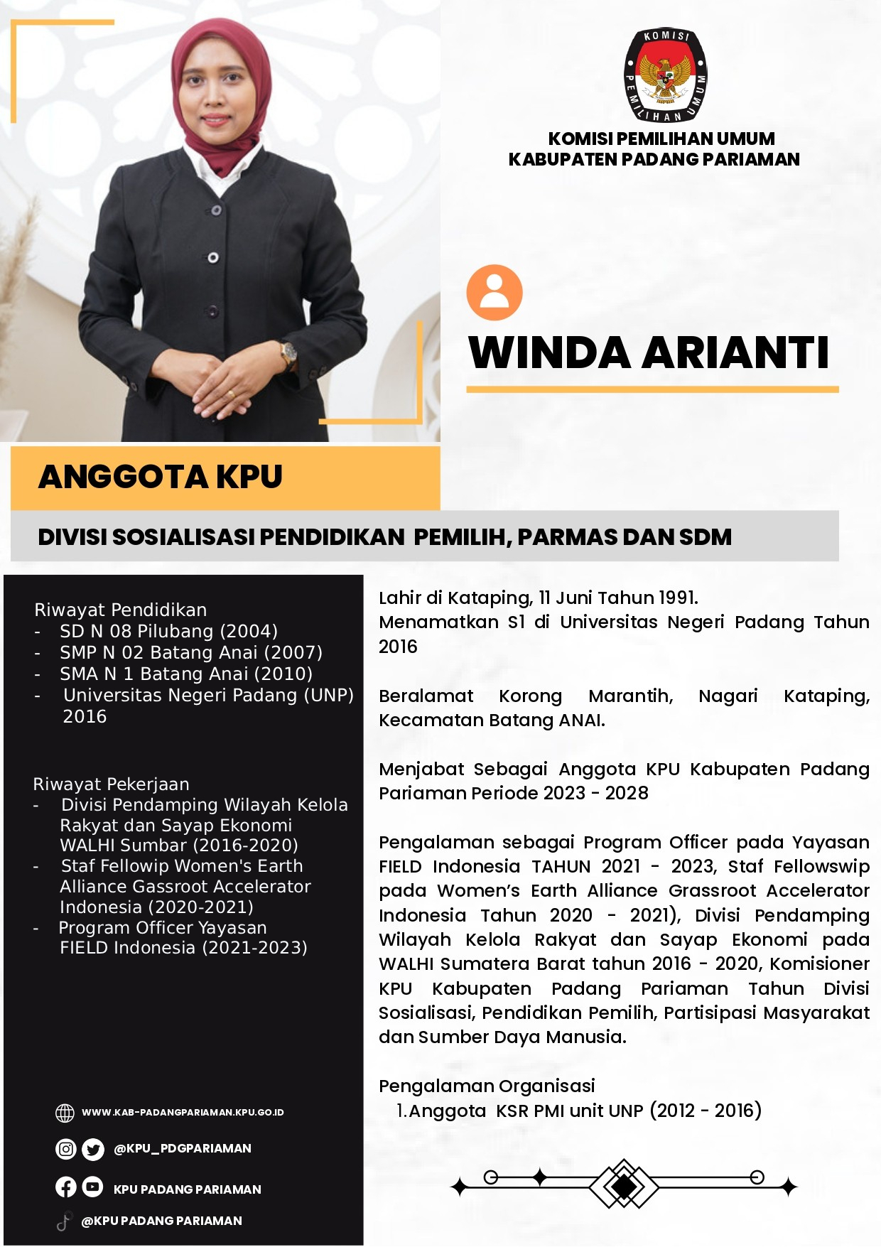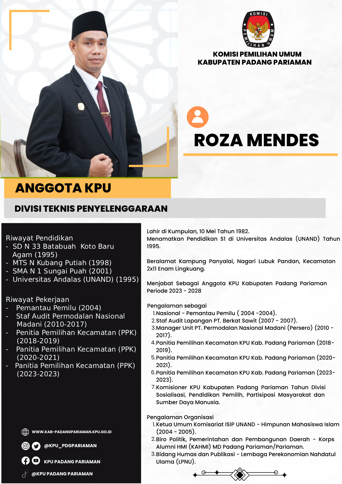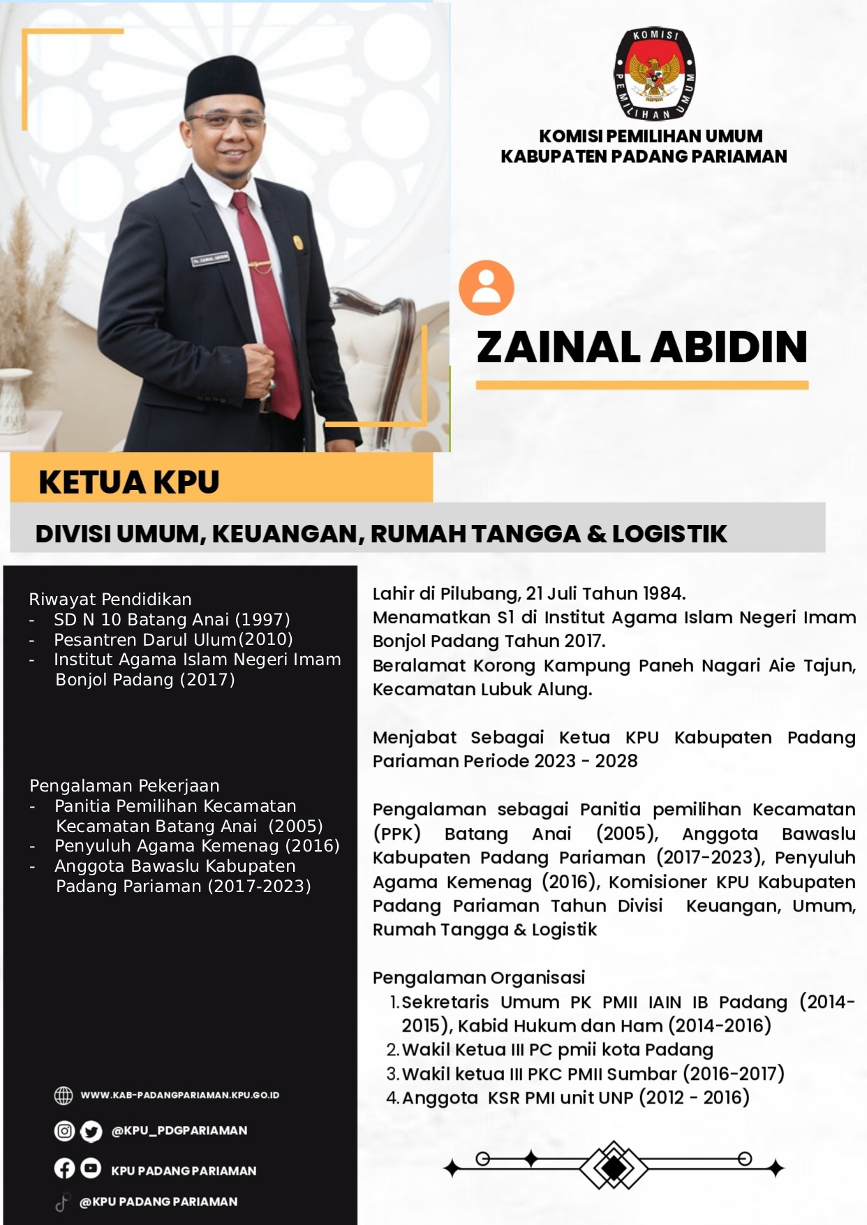 Profil Anggota KPU Kabupaten Padang Pariaman Anggota KPU Kabupaten Padang Pariaman Periode 2023-2028 1. Zainal Abidin (Ketua) 2. Doni Eka Putra 3. Roza Mendes 4. Sutan Syarif Hidayat 5. Winda Arianti Bagikan : Dilihat 633 Kali.